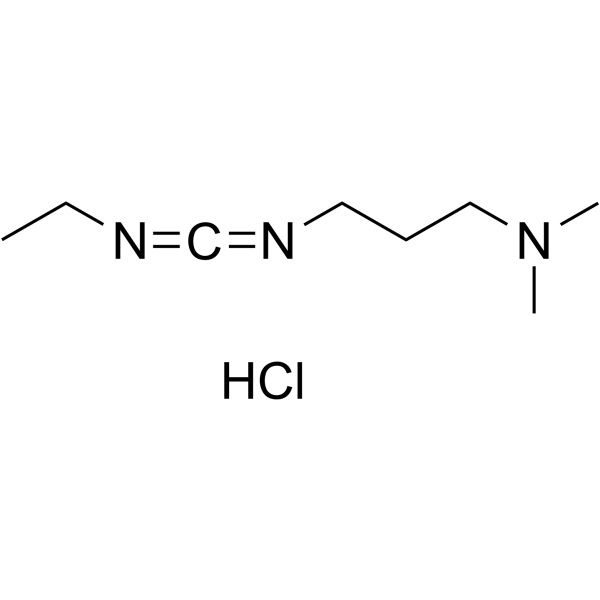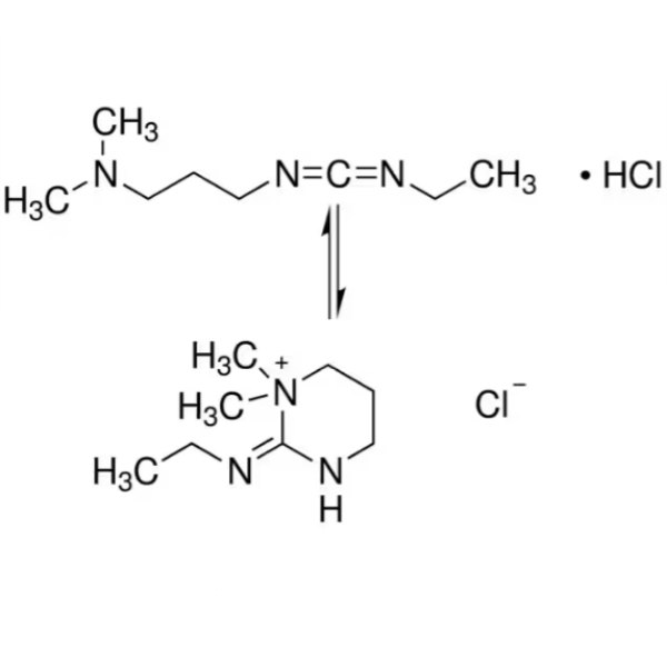 1-(3-Dimetilaminopropil)-3-El clorhidrato de etilcarbodiimida (EDC·HCl) (CAS: 25952-53-8) es un polvo cristalino blanco, fácilmente delicuescente, soluble en agua, soluble en etanol, utilizado como reactivo activador de grupos carboxilo en la síntesis de amidas, también utilizado para activar grupos fosfato, entrecruzamiento de proteínas y ácidos nucleicos y producción de inmunoacopladores. EDC-HCl se usa en el rango de pH de 4,0-6,0 y a menudo se usa junto con N-Hidroxisuccinimida (NHS) o N-Hidroxisulfosuccinimida sal sódica para mejorar la eficiencia del acoplamiento.