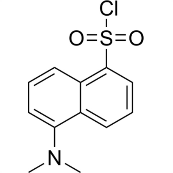 El cloruro de dansilo (DNSCl) (CAS: 605-65-2) es un reactivo fluorogénico utilizado para la detección de proteínas, aminoácidos N-terminales y péptidos mediante cromatografía líquida de alto rendimiento (HPLC) de fase inversa. También se utiliza para determinar el grado de marcado en quimotripsina y ovoalbúmina. Actúa como precursor para la síntesis de otros derivados como la dansilamida. El cloruro de dansilo no es fluorescente hasta que reacciona con aminas. Las dansilamidas resultantes tienen rendimientos cuánticos de fluorescencia y máximos de emisión ambientalmente sensibles junto con grandes cambios de Stokes. Esta propiedad de fluorescencia sensible al medio ambiente ha convertido al cloruro de dansilo en una herramienta importante para los estudios biofísicos.
