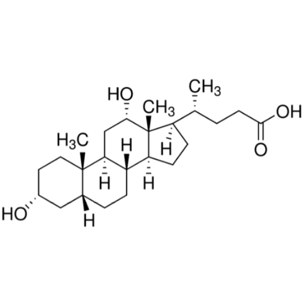 El ácido desoxicólico (CAS: 83-44-3) suele estar conjugado con glicina o taurina y actúa como detergente en la emulsificación de grasas para su absorción intestinal.