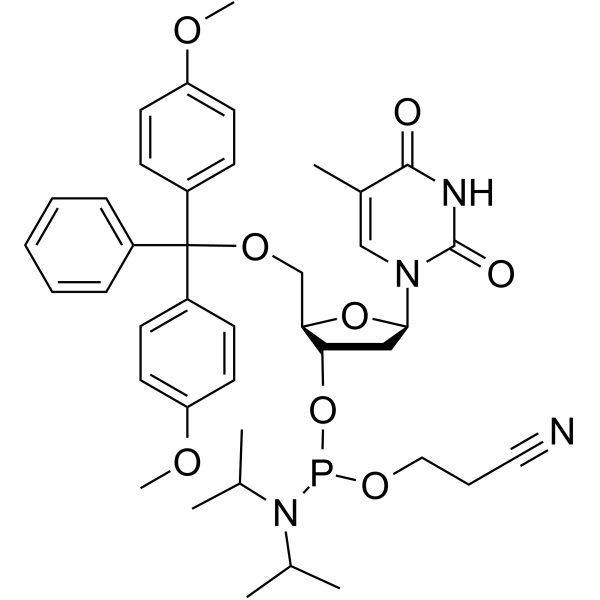 | Sinónimos | 5'-O-DMT-Timidina 3'-CE Fosforamidita; 5'-O-DMT-2'-Desoxitimidina-3'-CE Fosforamidita; 5'-Dimetoxitritilo-3'-Desoxitimidina 2'-[(2-Cianoetil)-(N,N-Diisopropil)]-Fosforamidita; 5'-O-(4,4'-Dimetoxitritil)-2'-Desoxitimidina-3'-(2-Cianoetil-N,N-Diisopropil)fosforamidita; 5'-O-[Bis(4-metoxifenil)(fenil)metil]-3'-O-[(2-cianoetoxi)(diisopropilamino)fosfino]timidina; 5'-O-[Bis(4-Metoxifenil)PhMe]-Timidina 3'-[2-Cianoetil N,N-bis(1-Metiletil)fosforamidita] |