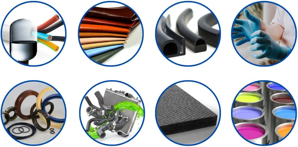 Las aplicaciones incluyen el uso en componentes de llantas neumáticas, llantas sólidas, correas, mangueras, cables, soportes para automóviles, casquillos y productos mecánicos en general que están expuestos a condiciones operativas dinámicas continuas e intermitentes y requieren protección contra la ozonización.