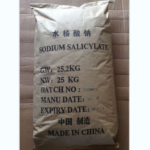 Salicilato de Sodio (CAS: 54-21-7), principales aplicaciones: materias primas de síntesis orgánica, antipirético, analgésico, anti-reumatismo, utilizado principalmente en el tratamiento del reumatismo agudo y la artritis reumatoide. También puede ser ampliamente utilizado en cosméticos, medicamentos veterinarios, pesticidas, piensos, cría de animales, exploración petrolera, aditivos para la extracción de petróleo y fabricación, adición y auxiliares de cosméticos y otros productos industriales.